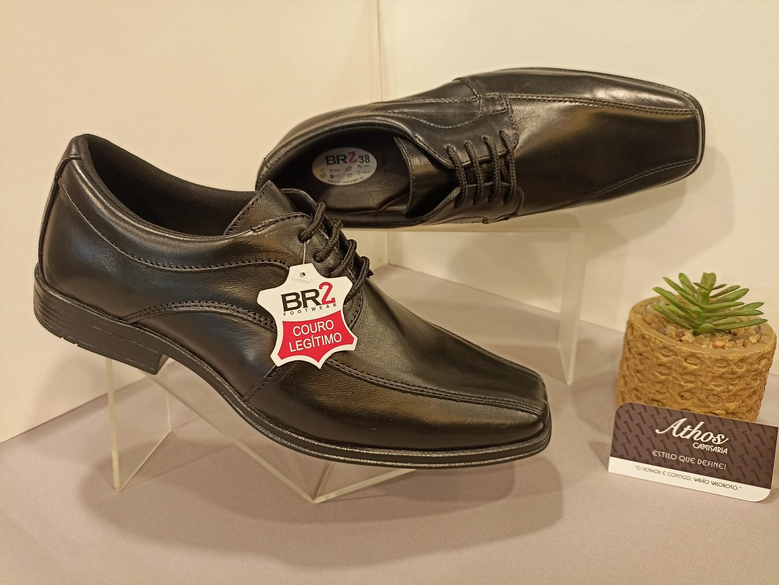 Modelo clássico de sapato social de amarrar, na cor preta. Pertence ao estilo Derby, caracterizado pelas abas laterais costuradas sobre o peito do pé. A etiqueta da BR2 Footwear confirma que é produzido em couro legítimo. Com um design limpo, costura aparente e bico quadrado, este sapato é um item essencial no guarda-roupa masculino para ocasiões formais.