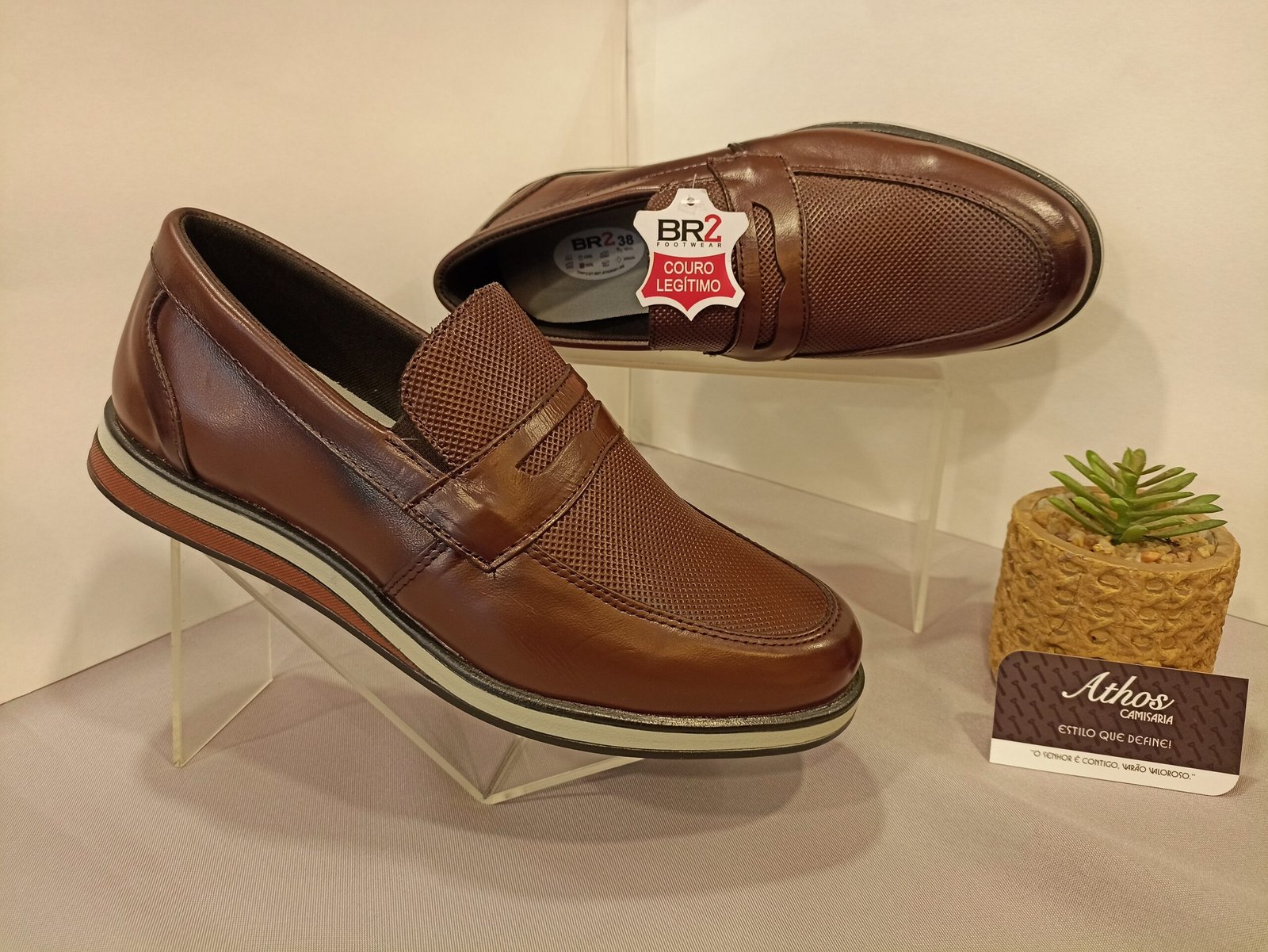 Um sapato loafer (slip-on) que une conforto e estilo casual. Na cor marrom, este calçado da BR2 Footwear é feito em couro legítimo e se destaca pela combinação de texturas: couro liso nas laterais e um material com trama estilo mesh na parte superior, garantindo mais respirabilidade. O solado moderno, com listras brancas e vermelhas, confere uma aparência esportiva e contemporânea.