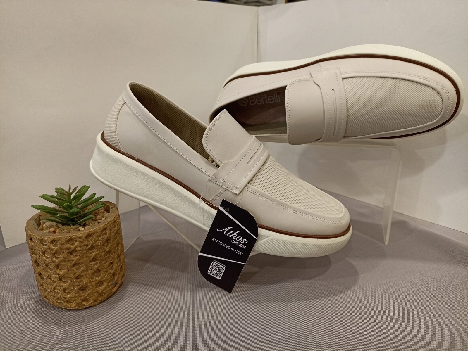 Um sapato masculino de vanguarda no estilo loafer, na cor off-white. Este modelo da marca Bertelli se destaca pelo design arrojado, com um solado branco robusto tipo plataforma, que lhe confere um visual moderno e urbano. O cabedal combina um material liso com uma textura de malha respirável na parte frontal. É a escolha perfeita para quem busca um calçado estiloso e confortável para compor looks casuais e contemporâneos.
